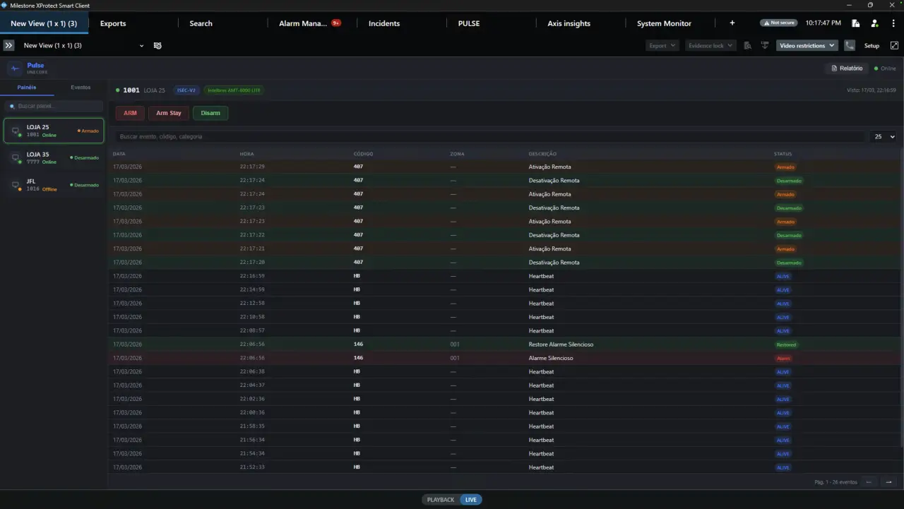 Plugin profissional de integração de painéis de alarme para o Milestone XProtect VMS. Gerencie eventos, envie comandos e audite tudo sem sair do ambiente do operador.